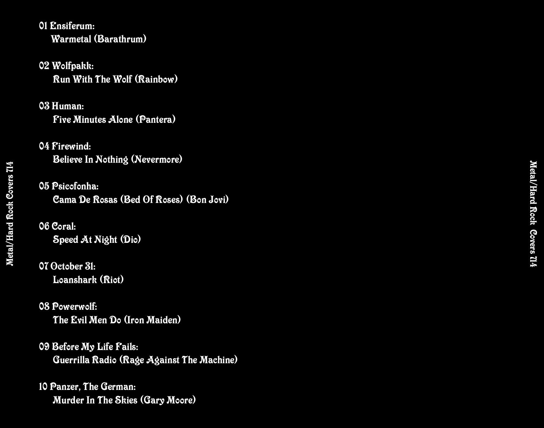 | Length / Продолжительность: 00:45:42 Tracks / Треклист: 01 Ensiferum - Warmetal (Barathrum) 02 Wolfpakk - Run With The Wolf (Rainbow) 03 Human - Five Minutes Alone (Pantera) 04 Firewind - Believe In Nothing (Nevermore) 05 Psicofonha - Cama De Rosas (Bed Of Roses) (Bon Jovi) 06 Coral - Speed At Night (Dio) 07 October 31 - Loanshark (Riot) 08 Powerwolf - The Evil Men Do (Iron Maiden) 09 Before My Life Fails - Guerrilla Radio (Rage Against The Machine) 10 Panzer, The German - Murder In The Skies (Gary Moore) | |
