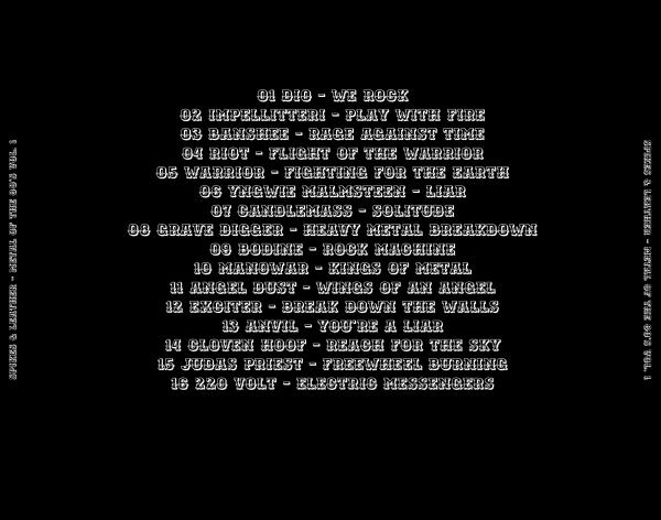 | Length / Продолжительность: 01:12:32 Tracks / Треклист: 01 Dio - We Rock 02 Impellitteri - Play With Fire 03 Banshee - Rage Against Time 04 Riot - Flight Of The Warrior 05 Warrior - Fighting For The Earth 06 Yngwie Malmsteen - Liar 07 Candlemass - Solitude 08 Grave Digger - Heavy Metal Breakdown 09 Bodine - Rock Machine 10 Manowar - Kings Of Metal 11 Angel Dust - Wings Of An Angel 12 Exciter - Break Down The Walls 13 Anvil - You're A Liar 14 Cloven Hoof - Reach For The Sky 15 Judas Priest - Freewheel Burning 16 220 Volt - Electric Messengers | |