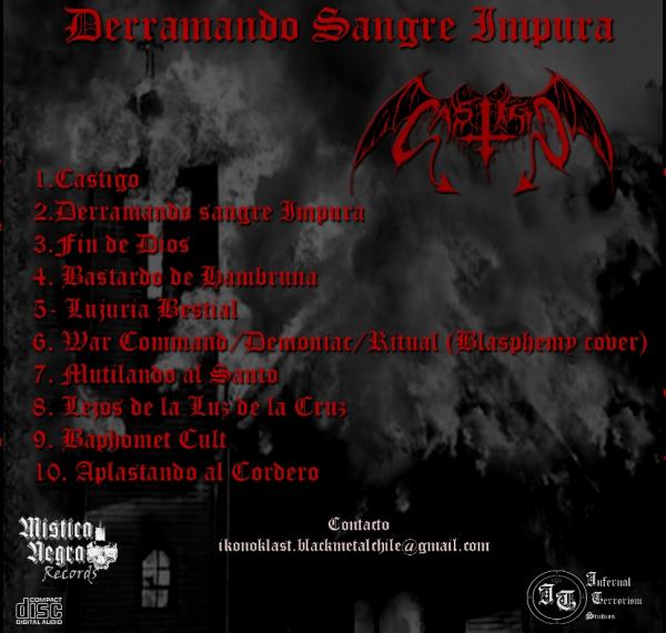 | Length / Продолжительность: 00:35:21 Tracks / Треклист: 01. Castigo 02. Derramando sangre Impura 03. Fin de Dios 04. Bastardo de la Hambruna 05. Lujuria Bestial 06. War Comand / Demoniac / Ritual (Blasphemy cover) 07. Mutilando al santo 08. Lejos de la luz de la cruz 09. Baphomet cult 10. Aplastando al cordero | |