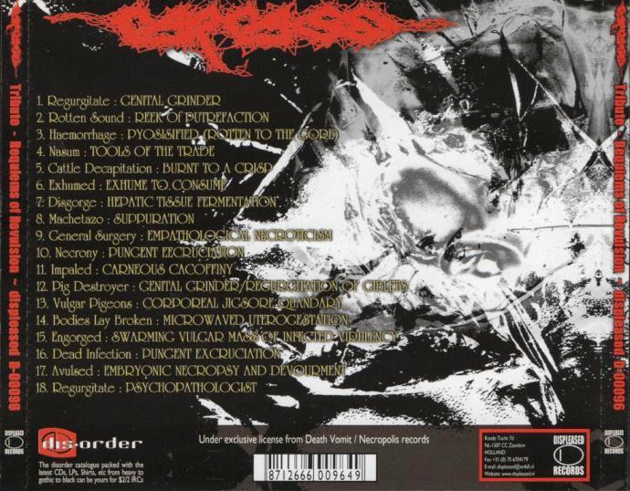 | Length / Продолжительность:01:02:37 Tracks / Треклист: 01 Regurgitate - Genital Grinder 02 Rotten Sound - Reek Of Putrefaction 03 Haemorrhage - Pyosisified (Rotten To The Gore) 04 Nasum - Tools Of The Trade 05 Cattle - Decapitation Burnt To A Crisp 06 Exhumed - Exhume To Consume 07 Disgorge - Hepatic Tissue Fermentation 08 Machetazo - Suppuration 09 General Surgery - Empathological Necroticism 10 Necrony - Pungent Excruciation 11 Impaled - Carneous Cacoffiny 12 Pig Destroyer - Regurgitation Of Giblets 13 Vulgar Pigeons - Corporeal Jigsore Quandary 14 Bodies Lay Broken - Microwaved Uterogestation 15 Engorged - Swarming Vulgar Mass Of Infected Virulency 16 Dead Infection - Pungent Excruciation 17 Avulsed - Embryonic Necropsy And Devourment 18 Regurgitate - Psychopathologist | |