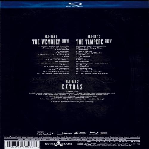 Disc 2 - The Tampere Show + Extras 01. Shudder Before the Beautiful 02. Yours Is an Empty Hope 03. Amaranth 04. She Is My Sin 05. Dark Chest of Wonders 06. My Walden 07. The Islander 08. Élan 09. Weak Fantasy 10. Storytime 11. Endless Forms Most Beautiful 12. Alpenglow 13. Stargazers 14. Sleeping Sun 15. Ghost Love Score 16. Last Ride of the Day 17. The Greatest Show on Earth 18. Weak Fantasy (Vancouver) 19. Nemo (Buenos Aires) 20. The Poet and the Pendulum (Mexico City) 21. Yours Is an Empty Hope (Joensuu) 22. 7 Days to the Wolves (Espoo) 23. Sleeping Sun (Masters of Rock) 24. Sahara (Tampa Bay) 25. Edema Ruh (acoustic) (Nightwish Cruise) 26. Last Ride of the Day (Rock in Rio) 27. Élan (Sydney) 28. Richard Dawkins Interview (Wembley)